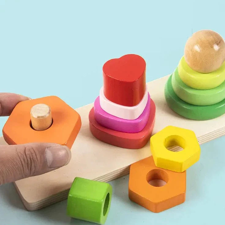 TetrapillarTowert : Comprend 16 blocs géométriques accompagnés d'une base en bois comportant 4 supports. Il offre une variété de formes (Fleur, Cercle, Cœur, Hexagone) de quatre couleurs.
