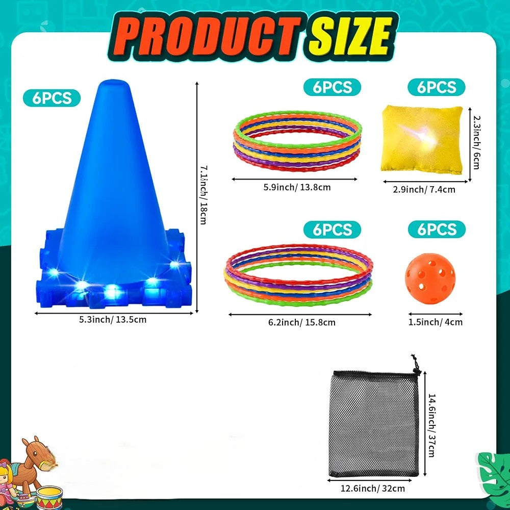 Les lumières LED intégrées aux sacs de haricots, cônes, balles et anneaux ajoutent une touche colorée et magique, rendant les jeux nocturnes encore plus excitants. Elles créent une ambiance festive qui stimule l’intérêt et l’amusement des enfants comme des adultes.