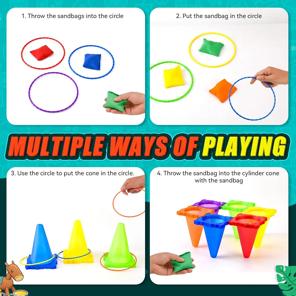 Découvrez l’ensemble de jeu de carnaval 3 en 1 JoyToss comprenant 30 pièces pour des heures de divertissement : 6 grands anneaux, 6 petits anneaux, 6 balles, 6 cônes de 9,3 pouces et 6 sacs de haricots, tous conçus pour des jeux de lancer amusants et interactifs. Ce kit complet garantit une expérience ludique pour toute la famille.