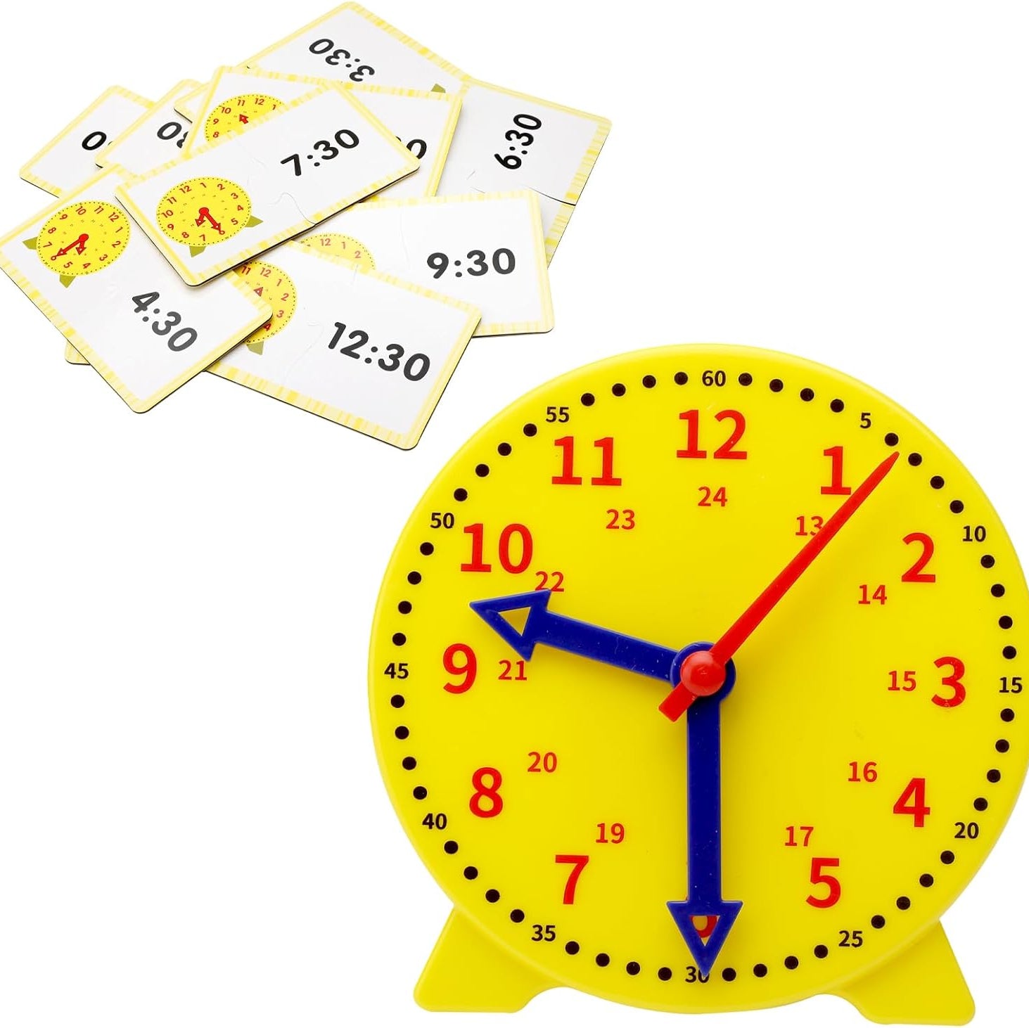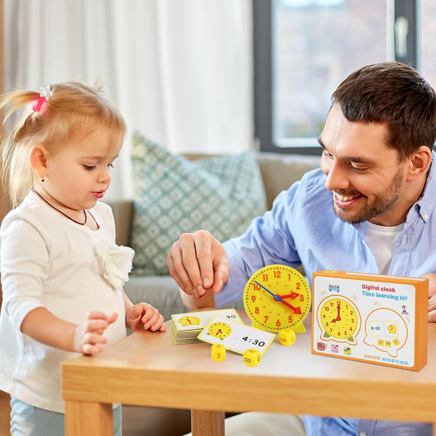 Grâce à l’horloge avec aiguilles ajustables, aux cartes recto-verso et aux dés de temps, l’enfant apprend de manière active. Il associe chiffres, heures et minutes, ajuste les aiguilles et relève des défis adaptés à son âge. Chaque activité stimule la réflexion, la coordination et la résolution de problèmes, tout en renforçant sa compréhension de la lecture de l’heure.